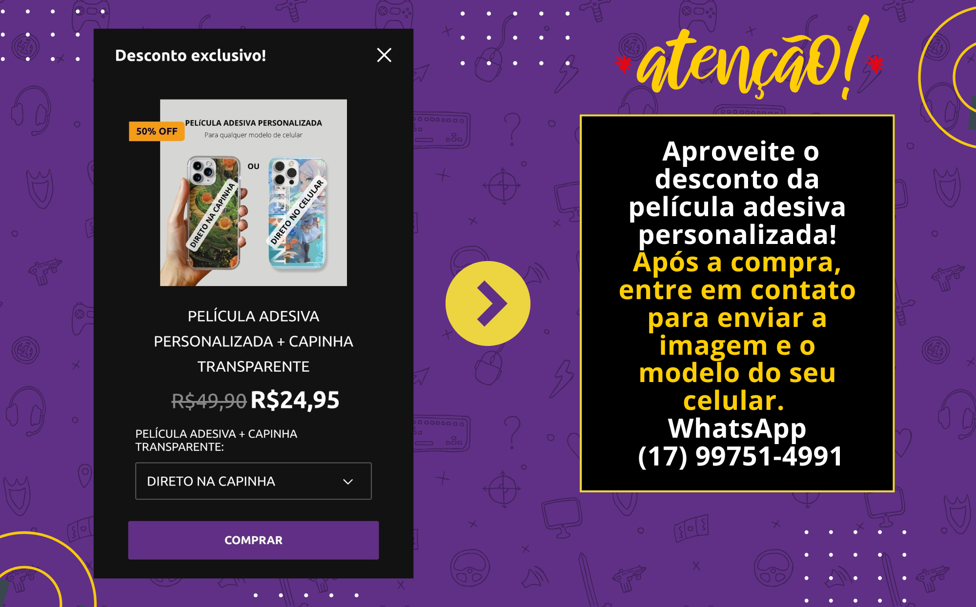 Aceite da Oferta Exclusiva: Na tela de desconto, selecione o tipo de película adesiva (ex: Direto no Celular Gliter) e clique em "COMPRAR" para adicionar o desconto ao carrinho.